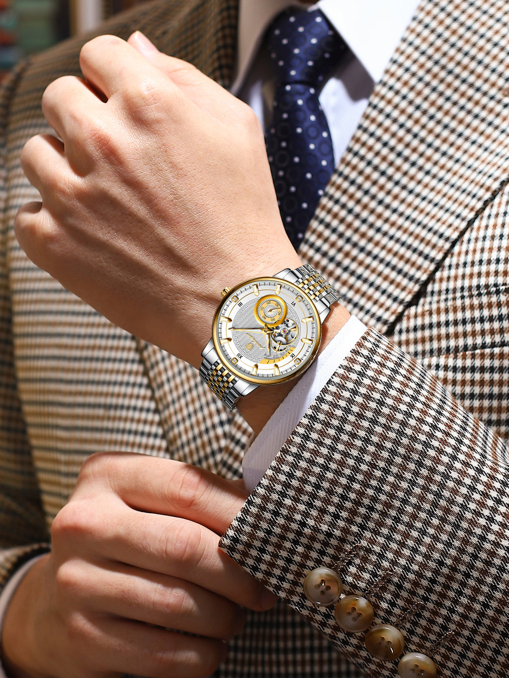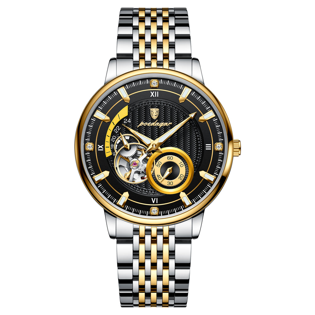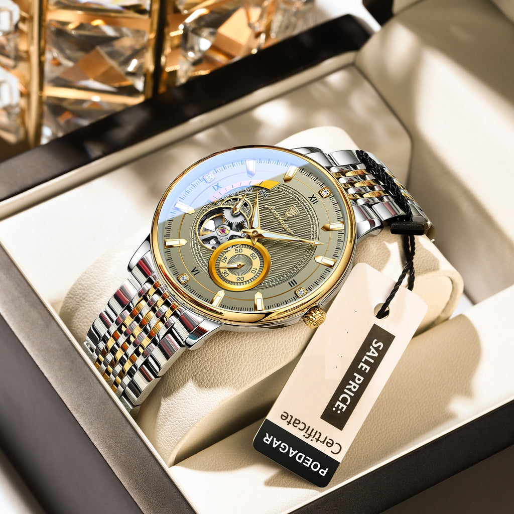 POEDGAR Automatic Mechanical Luxury skeleton wrist watch stainless steel strap Analog Watch For Men